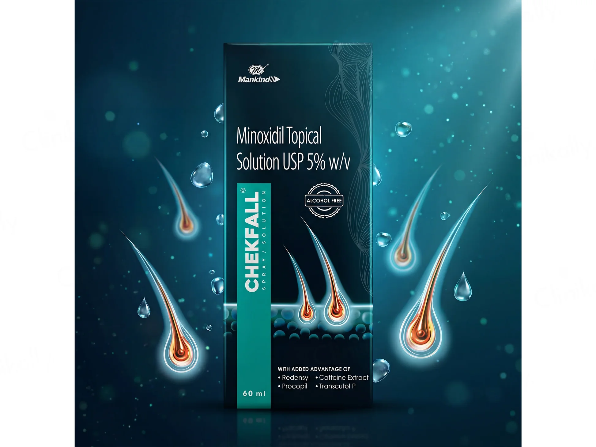Chekfall 5% Solution is a topical hair treatment designed to help manage hair loss and promote natural hair regrowth. It contains Minoxidil 5%, a clinically proven ingredient that works by improving blood flow to the hair follicles, thereby stimulating hair growth and strengthening weak hair roots.